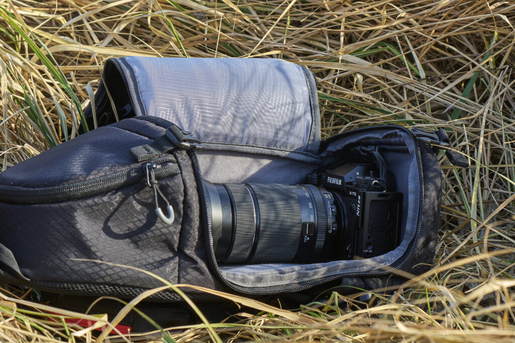 Wer kennt die Frage nicht nehme ich den Kamerarucksack mit oder hänge ich mir die Kamera um. Umhängen ist für mich selten eine Alternative da ich den Gurt immer als störend empfinde und auch das Gefühl habe direkt als Tourist erkannt zu werden. Nur so in der Hand halten ist in der Regel auch keine sinnvolle Option ich hatte es oft genug ausprobiert. Den Kamerarucksack immer wieder auf und abzusetzen um die Kamera auszupacken ist allerdings erst recht nervend gerade wenn man in Gegenden unterwegs ist in denen es sehr voll und eng ist. Oft sucht man dann erst eine stille Ecke um die Kamera auszupacken oder auch wieder zu verpacken.Ein Wetterschutz bei plötzlich auftretendem Regen oder ähnlichem ist auch nur gegeben wenn der Kamerarucksack genutzt wird.Es ist alles nicht so optimal. Auf der Suche nach einer Lösung stieß ich auf sogenannte Sling Bags bei denen es sich um kleinere Rucksäcke handelt die mit nur einem Tragegurt versehen über eine Schulter getragen werden können. Bei Bedarf zieht man ihn vor den Bauch und kommt ohne Probleme an die Kamera. Das entnehmen und auch wieder verstauen der Kamera funktioniert auf kleinstem Raum. Also geht die suche nach der der für mich optimalen Lösung los. Meine persönlichen vorgaben für einen solchen Rucksack sind aus meiner Sicht sehr überschaubar und sind kein absolutes muss.Als erstes sollte in die Kamera meine Pentax K1 mit dem 24-70mm passen die Gegenlichtblende für den Transport umzudrehen würde mich stören. Ein separates Fach für die Geldbörse und Schlüssel wäre gut da gerade zur warmen Jahreszeit oft die Frage im Raum steht wohin damit. Super wäre wenn noch eine dünne Regenjacke Platz finden würde ist aber kein muss. Das letzte Kriterium ist natürlich der Preis das ganze soll schließlich nicht unbedingt zu preisintensiv sein. Die Suche über das Internet war etwas ernüchternd für mich da die Zahl der Anbieter für so einen Rucksack speziell für eine Kamera überschaubar ist. Bekannte Hersteller bieten diese Art von Rucksack der mir dann aber schon wieder zu groß ist es sollte ja handlich bleiben und ein Stativ sollte ja auch nicht befestigt werden. Es ist für mich auch nicht Notwendig Platz für Wechselobjektive zu haben. Auch der Preis schreckt mich bei dem ein oder anderen schon ab. Bei der weiteren Recherche stoße ich auf den Rucksack der Firma K&F Concept der mit seinen angegebenen 10 Litern Fassungsvermögen auf den ersten Blick etwas klein wirkt. Die weiteren Eckdaten auf der Internetseite der Firma lassen mich jedoch sehr neugierig werden. Da steht zum Beispiel Wasserdicht.Die weitere Beschreibung und auch die Bilder bringen mich dazu diesen Rucksack zu bestellen um ihn vor Ort zu testen. Kurze Zeit später ist der Rucksack vor Ort nach dem auspacken ist die Überraschung groß den der Rucksack macht einen guten Eindruck die Größe ist für mich in Ordnung und die zwei getrennten Fächer überzeugen wenn jetzt noch alle anderen Vorgaben passen bekommt er eine Chance.Als erstes entferne ich die variablen Trenner im Hauptfach es soll ja in erster Linie nur die Kamera passen. Dabei bemerke ich das jemand mitgedacht hat da die Öffnung des Hauptfaches sich so in der Größe ändern läßt so das die Kamera nicht ohne weiteres versehentlich herausfallen kann. Mit einen simplen Gurtstreifen der sich an den Enden mit zwei Schnappern arretieren läßt ist die Öffnung nur noch etwa halb so groß die Kamera kann jedoch weiterhin ohne Probleme entnommen werden. Ich finde das ist gut gelöst zumal die Reißverschlüsse sehr leicht gehen und die Wahrscheinlichkeit eines versehentlich zu weiten öffnens doch da sind.Als nächstes Teste ich wie die Kamera in das Hauptfach paßt. Die K1 passt mit dem 24-70mm ohne jeglich Probleme es ist sogar noch etwas Platz. Zu meiner Überraschung passt selbst die K3 mit dem montierten 70 – 210mm in das Hauptfach. Die Gegenlichtblende ist jedoch Seitenverkehrt zu montieren damit es passt. Aber gut zu wissen das es passt man weiß ja nie was man mal vorhat. Da sich seit einiger Zeit auch die Firma Fuji Film zur Ausrüstung mit dazugesellt hat wird natürlich auch hier ausgetestet was passt. Da die Fuji Film XT5 von Hause aus sehr klein ist passt das Weitwinkel XF 16-80 mm ohne jeglich Probleme.Das die Fuji Film XT5 auch mit dem angesetztem XF 70- 300 mm und richtig montierter Gegenlichtblende passt überrascht mich allerdings dann doch etwas.Die kleine Bauweise von Fuji Film kann hier einen Vorteil ausspielen. Da die Kameras soweit angedacht passen betrachte ich mir den Rucksack weiter und bemerke auf der Deckelinnenseite des Hauptfaches noch eine kleine Netztasche die sich mit einem Reißverschluss verschließen läßt. Es ist also auch ein sicherer Platz für ein Reserveakku oder auch weitere Speicherkarten vorhanden ohne das diese verloren gehen könne. Bleib also nur noch das kleinere Fach am oberen Ende des Rucksacks übrig. Auch hier gibt es einen sehr leichtgängigen Reißverschluss der das Fach verschließt und gefühlt verspricht länger zu halten.Das Fach reicht gut aus um seine Geldbörse zu verstauen plus eine Brille im Etui und noch paar dünne Handschuhe. Einfach nur Groß genug für meine Zwecke. Der Trageriemen ist ausreichend verstellbar und drückt nicht. Zusätzlich hat man dem Rucksack noch einen zweiten Riemen spendiert der einmal angelegt verhindern soll das Rucksack auf dem Rücken hin und herrutschten kann. Bei bedarf läßt dieser sich im unteren Bereich des Rucksackes in einer unscheinbaren Tasche verstauen wo er bei mir wohl auch bleiben wird da er beim nach vorne ziehen des Rucksackes immer erst gelöst werden muß.Der Rucksack macht sonst einen sauber verarbeiteten Eindruck. Zwei kleinere Kritikpunkte sollen aber auch genannt werden. Zum einen möchte ich die Wasserdichtigkeit etwas in Frage stellen da die Reißverschlüsse keinerlei Abdichtungen aufweisen. Auch das auf dem Rücken anliegende Mischgewebe dürfte eher dazu neigen sich mit Wasser vol